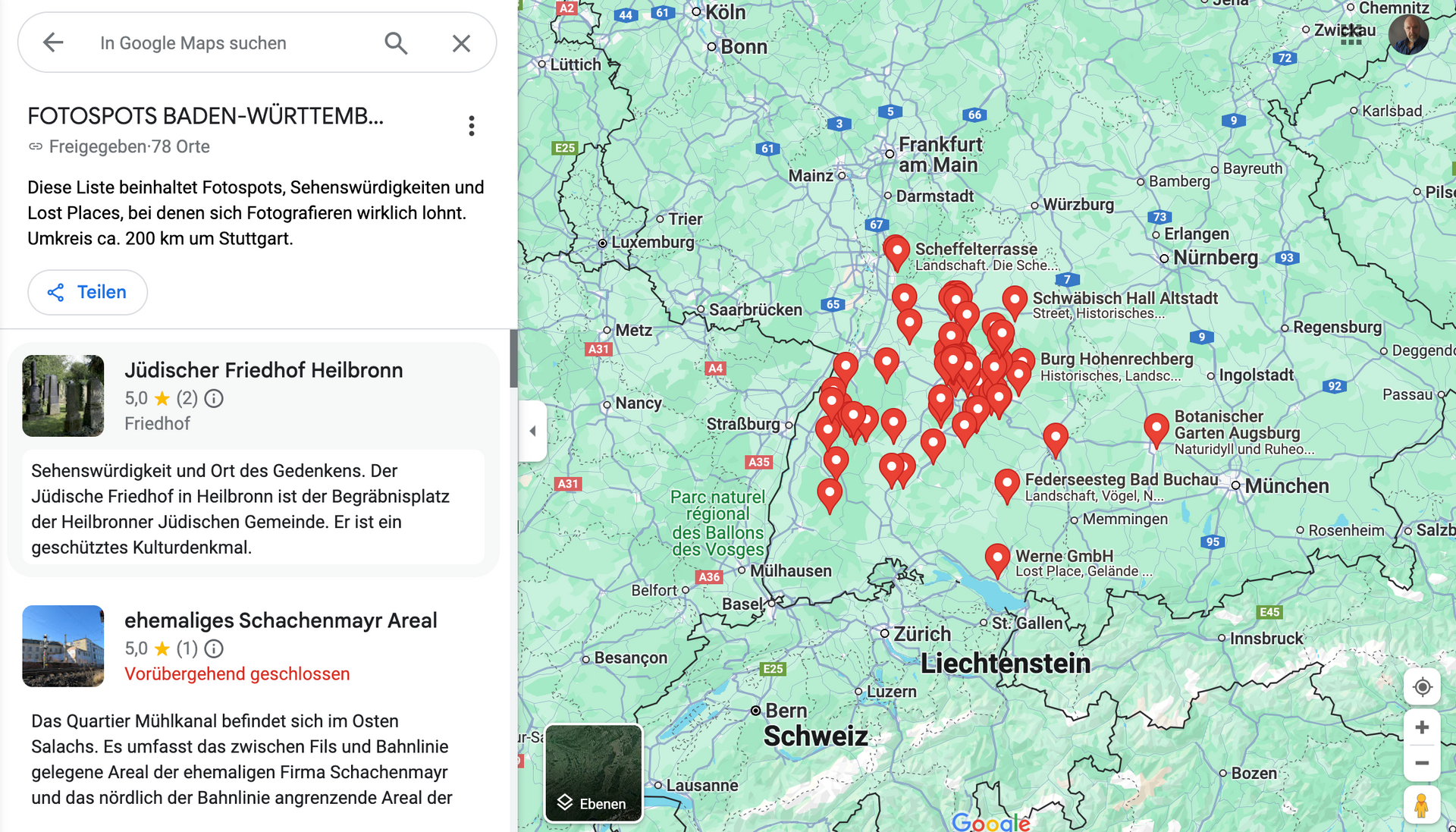 Ich habe deswegen schon vor einiger Zeit in Google Maps eine Liste bedeutender, spannender, historischer und einfach schöner Spots zusammengestellt, die für Jedermann/ Jederfrau zugänglich ist.