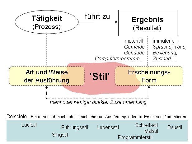 Wikipedia schreibt dazu: Der Ausdruck Stil bezeichnet eine „charakteristisch ausgeprägte Erscheinungsform“ (ursprünglich einer Sprache oder eines Kunstwerks) oder das „einheitliche Gepräge der künstlerischen Erzeugnisse einer Zeit“ (z. B. Bau-, Mal-, Rembrandt-, gotischer Stil). Ebenfalls mit "Stil", oft als Teilausdruck, wird die meist in engem Zusammenhang mit der Erscheinungsform einer Sache stehende „Art und Weise der Ausführung“ bezeichnet, z. B. der Stil, mit dem eine Sporttechnik ausgeführt wird.
