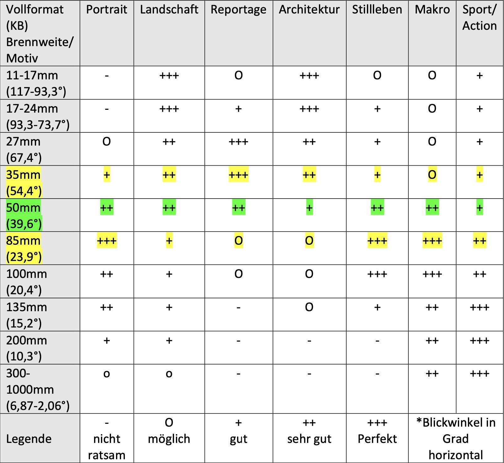 Wenn es eine sogenannte Universalbrennweite überhaupt gibt, dann sind das die „berühmten“ 50mm – wie aus der Tabelle zu entnehmen ist. Sie deckt nahezu jeden Bereich eines Genre optimal ab.