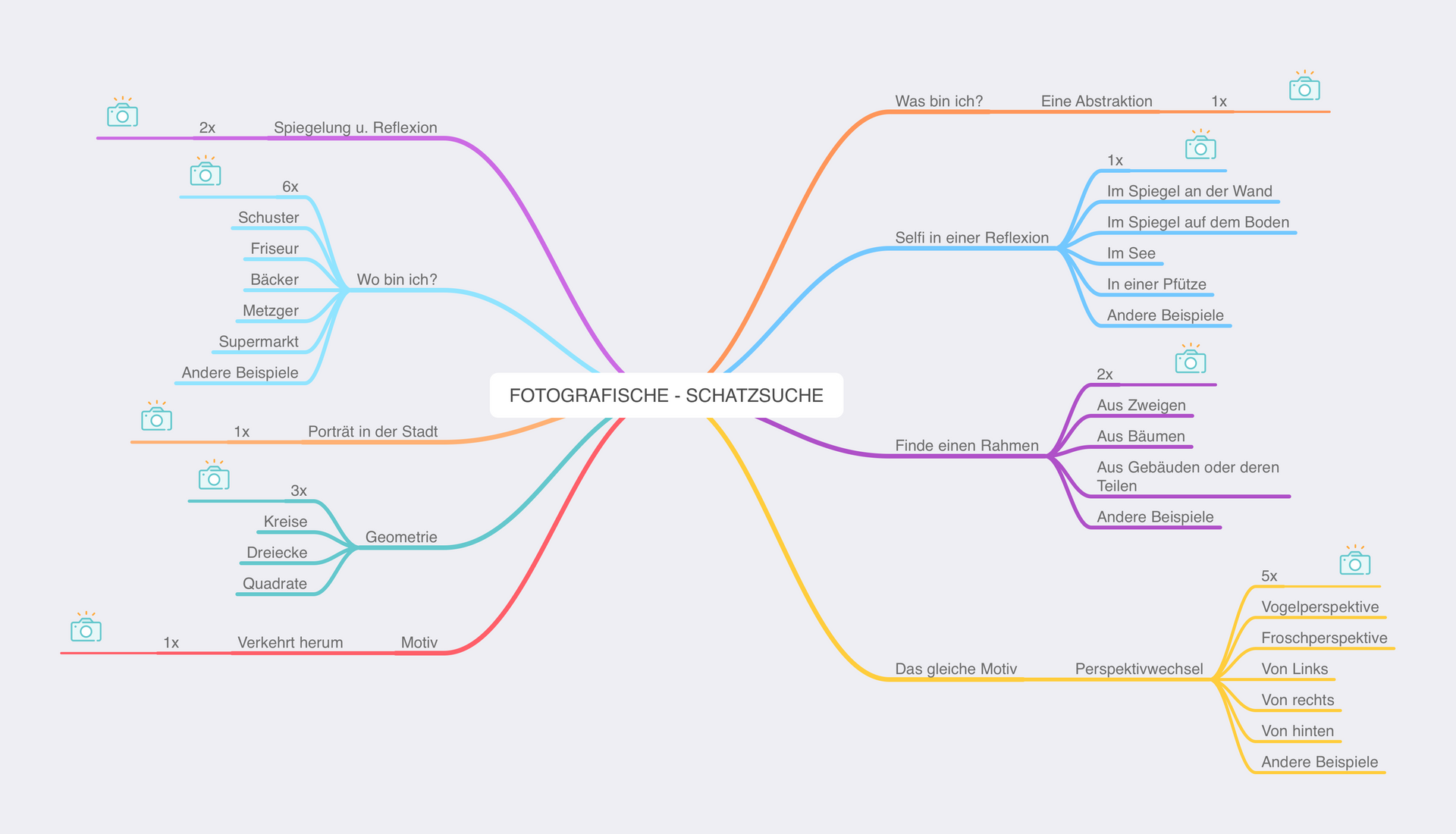 Suche Dir eines der Themen heraus und beginne damit die Aufgabe zu erfüllen. Die Anzahl der zu "schießenden" Fotografien findest Du jeweils vor bzw. hinter dem Kamerasymbol. Wo Du anfängst, ist gleichgültig. Starte einfach irgendwo und wenn Du Deine Aufgabe erledigt hast, dann beginne die Nächste.