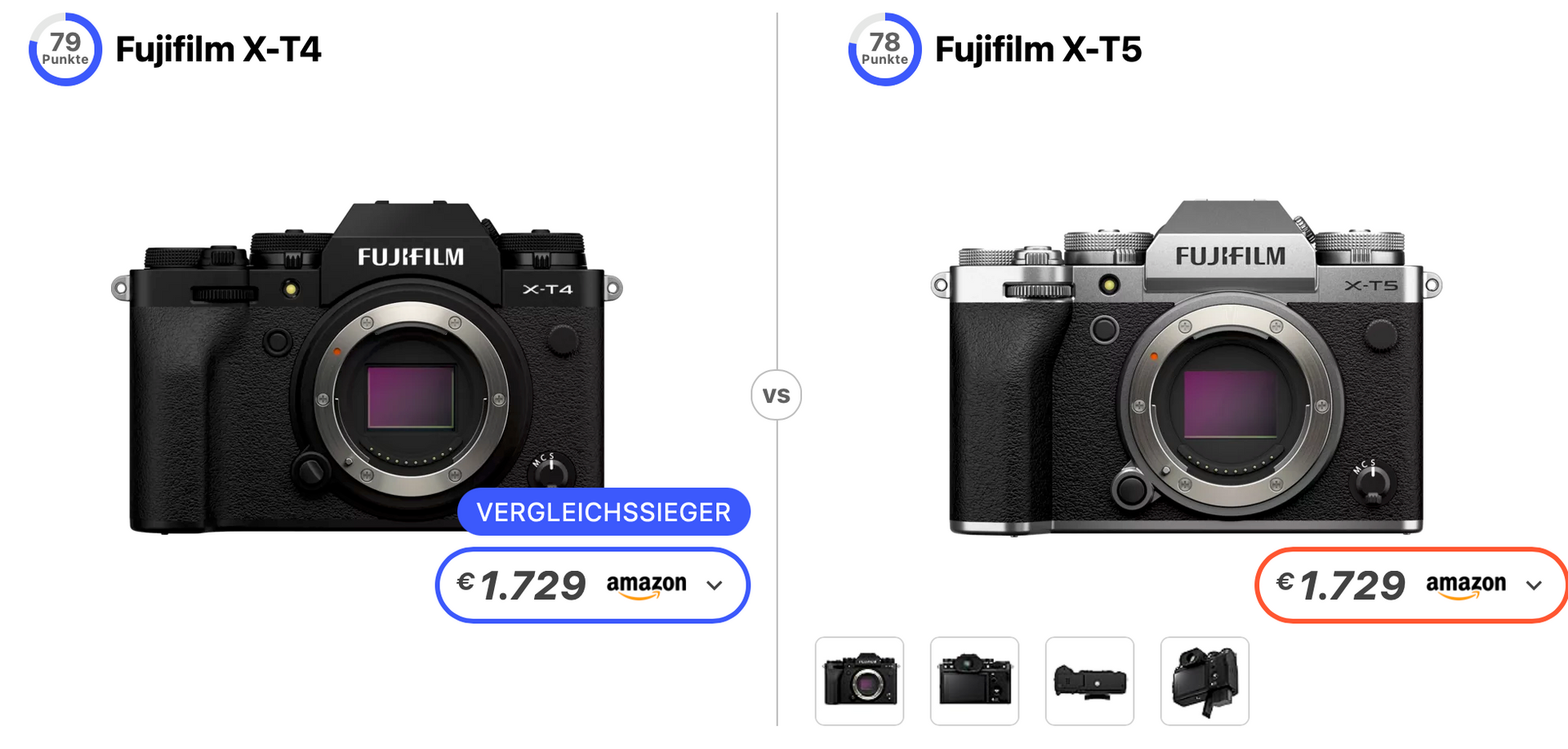 Die X-T4 gibt es bei Amazon mittlerweile neu für rd. 1.450 Euro. Die nicht mehr frische X-T5 kostet immerhin rd. 300 Euro mehr. Bei einem Espresso-Preis von 2,20 Euro sind das immerhin 136 Tassen Espresso – das reicht auf jeden Fall für einen Herzinfarkt erster Güte.