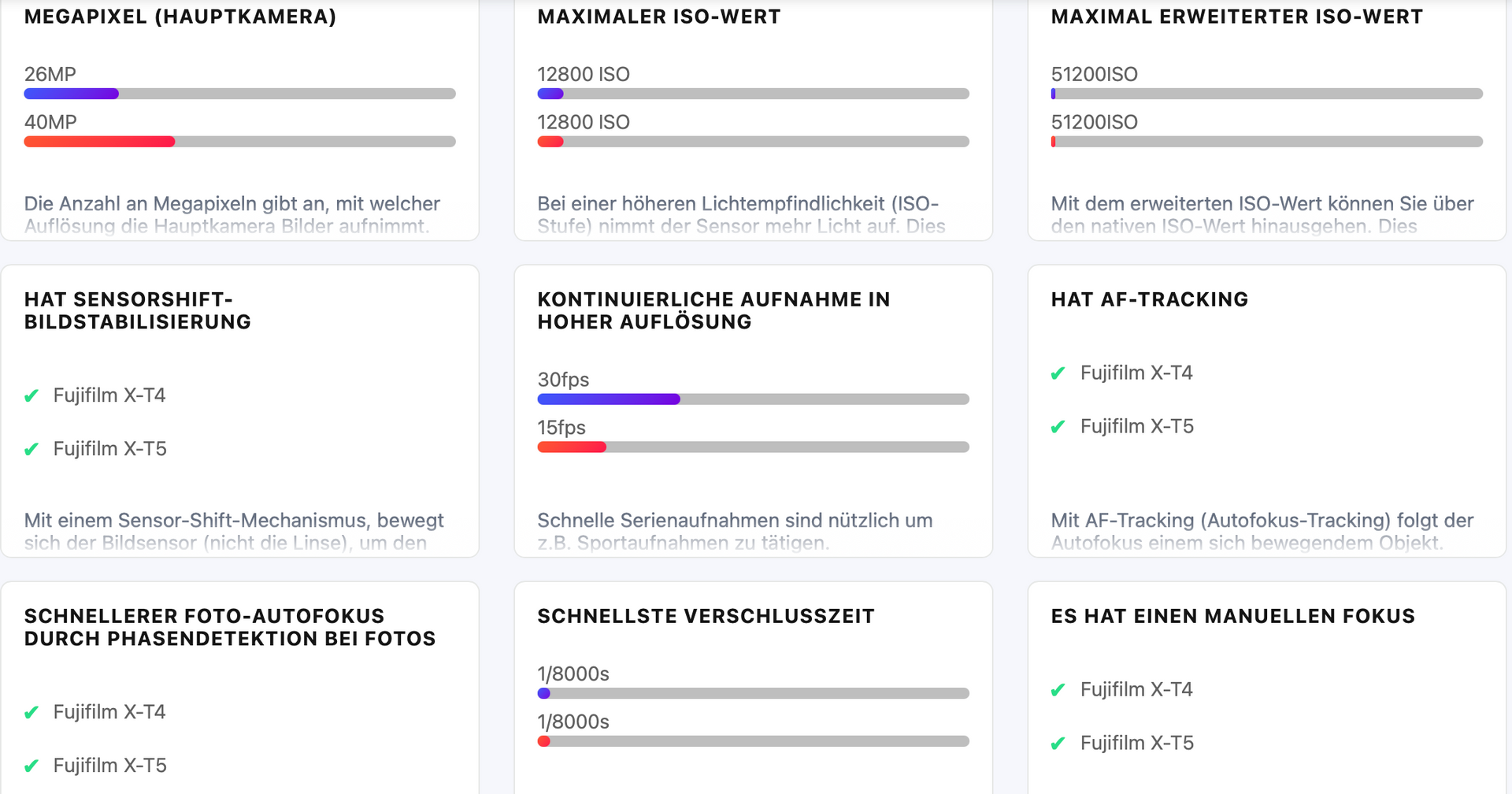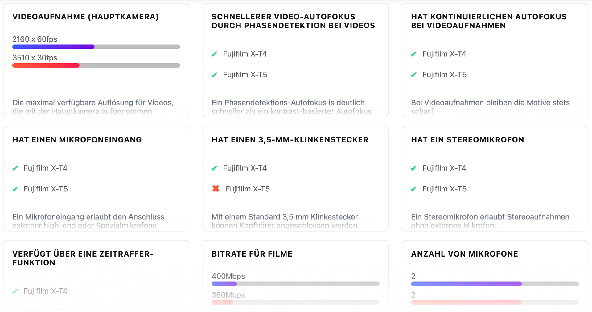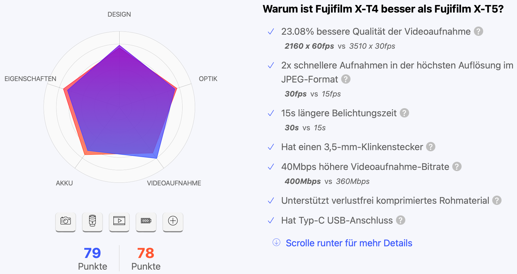 Die Zahlen sprechen für sich – nämlich nahezu ausnahmslos für die X-T4 (in Blau dargestellt).