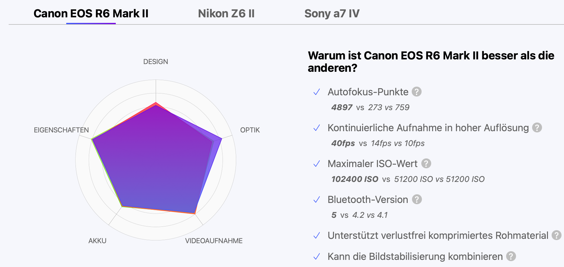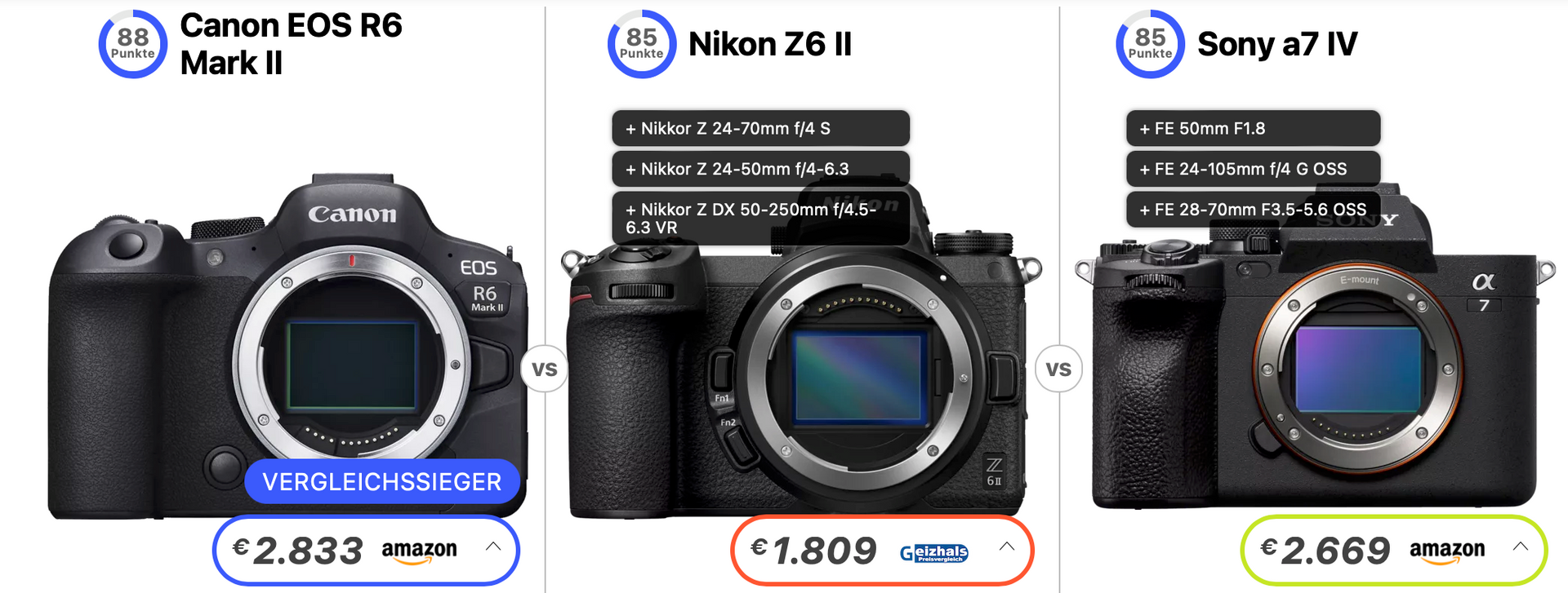 Hier dominieren die vergleichbaren Modelle von Canon EOS R50 und Nikon Z50. Fujifilm heranzuziehen wäre bezüglich der Pricerange nicht fair.