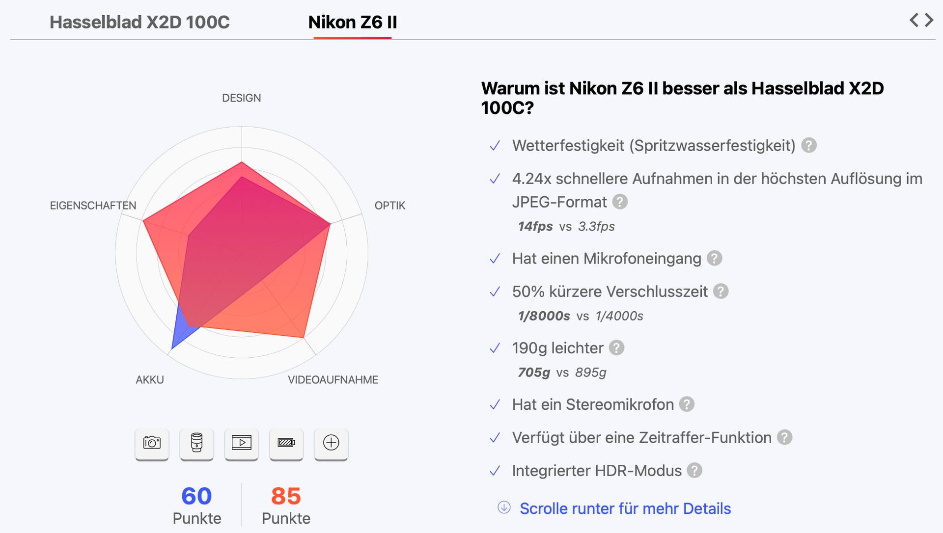 Und um noch einen drauf zu setzen – wer hätte es gedacht: die Leica SL2 beispielsweise schneidet wesentlich schlechter ab als eine Nikon Z6II, kostet jedoch das Vierfache. Man muss Leica wirklich mögen.