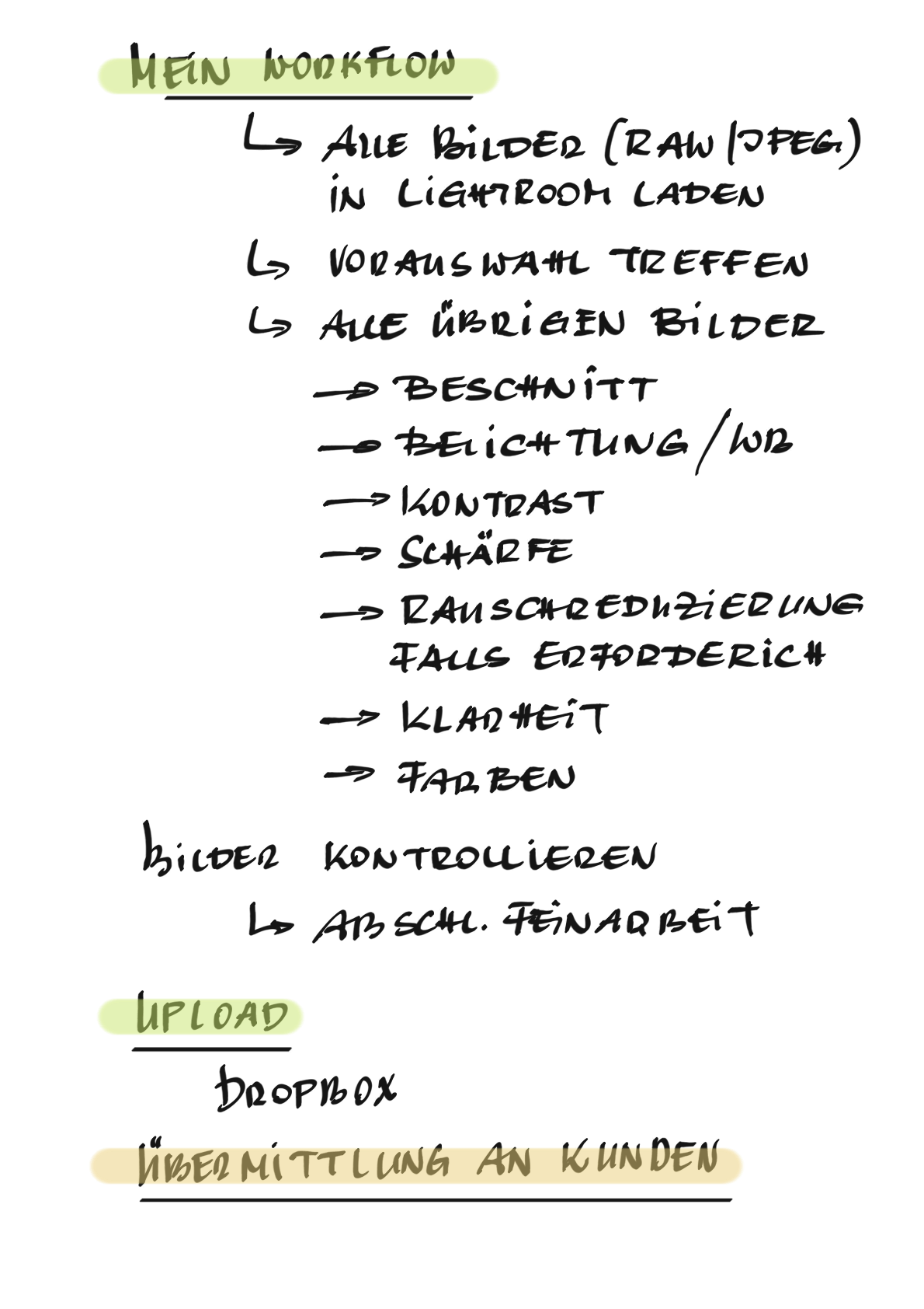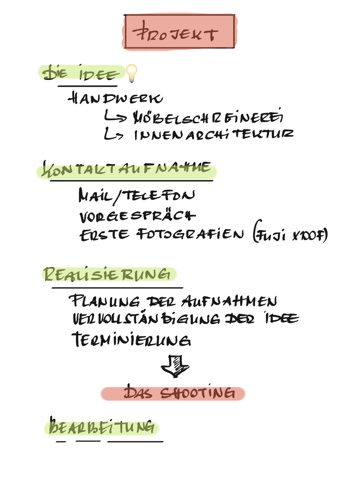 Während des Fotografierens und ebenso bei der Bearbeitung der Bilder des Preshootings im Nachgang verfeinert sich die Idee und es entsteht ein Ablaufplan, was und wie etwas fotografiert werden soll. Das wird zwar im finalen Shooting meistens doch etwas anders gemacht, aber es ist m.E. immer gut, einen Plan im Kopf zu haben.