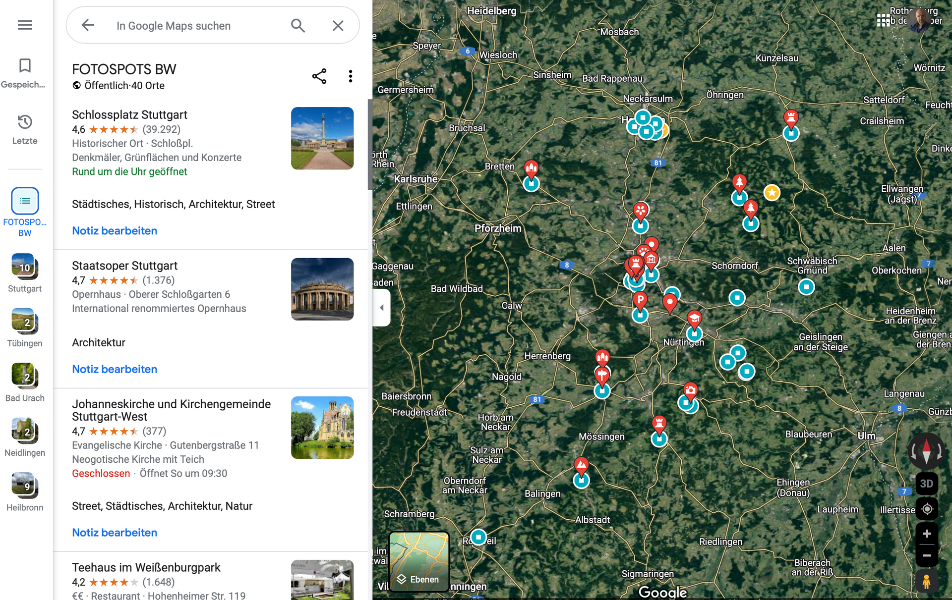 Viele der in meiner geteilten, öffentlichen Liste geteilten Spots habe ich selbst besucht, für gut befunden und gespeichert. Andere stehen noch auf meinem Plan, um sie in nächster Zeit zu besuchen.